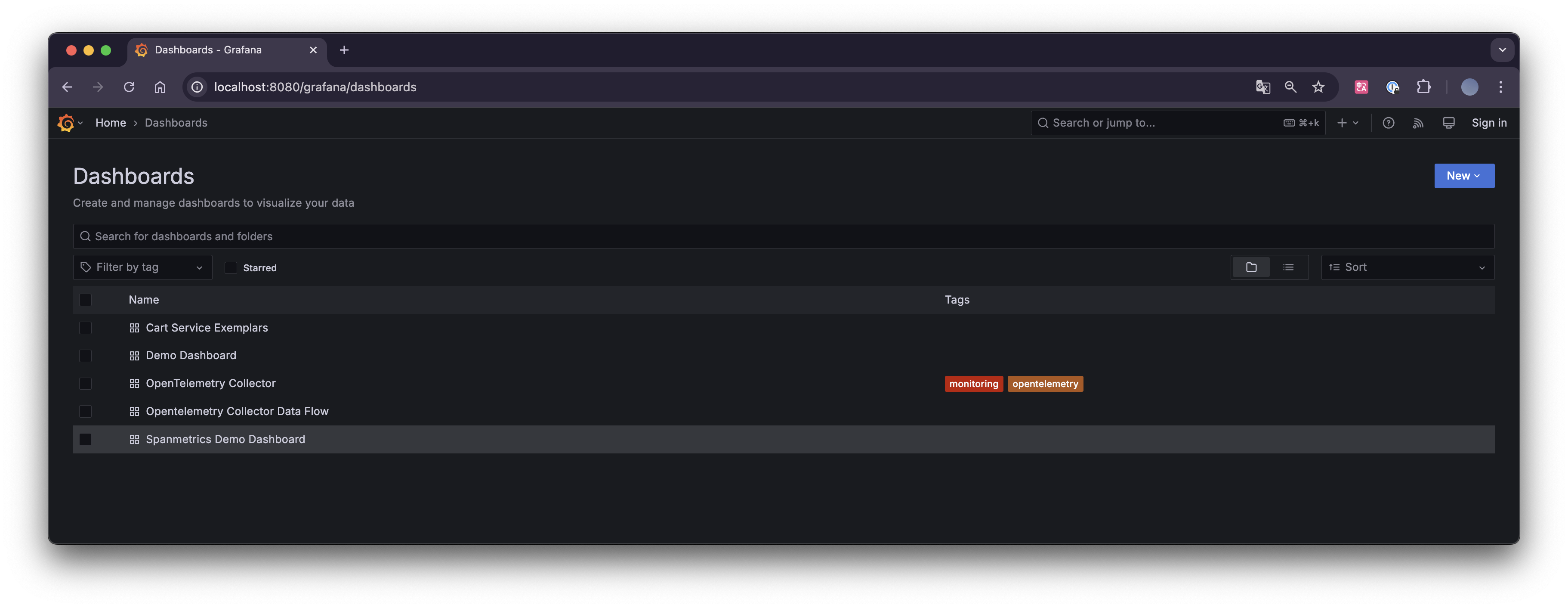 위의 주소로 접근하면 OTel Demo를 설치하였을 때 생성된 Dashboard들이 보이는데, 이때 OpenTelemetry Collector를 모니터링하는 대시보드와 각 서비스의 대기 시간과 요청 속도를 분석하기 위한 여러 쿼리 및 차트가 포함되어 있는 대시보드가 존재합니다.