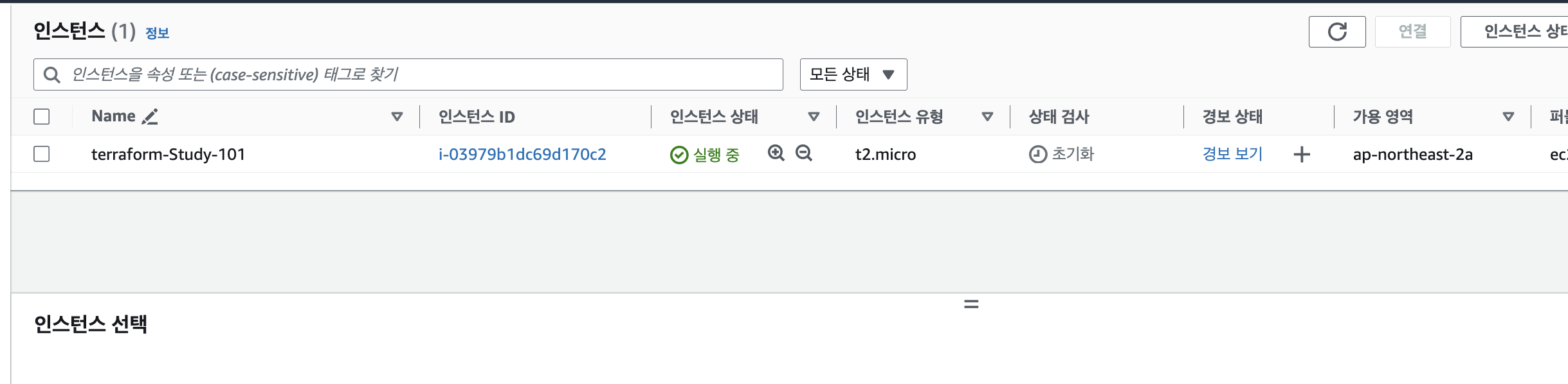 그 후 aws managed console에서 ec2에 접근하신 뒤 확인해보시면 아래와 같이 EC2 인스턴스가 생성된 것을 확인하실 수 있습니다.
