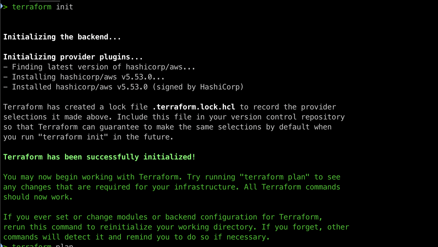 terraform init 명령어를 실행하니 terraform 코드에서 사용된 구문을 기반으로 필요한 프로바이더 플러그인을 찾고 설치하는 과정이 진행되었습니다. 추가로 프로바이더, 모듈, 백엔드 구성이 설정되고 변경되는 경우에도 이 명령을 수행해야 한다고 알려줍니다.