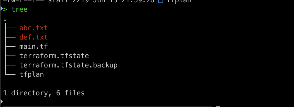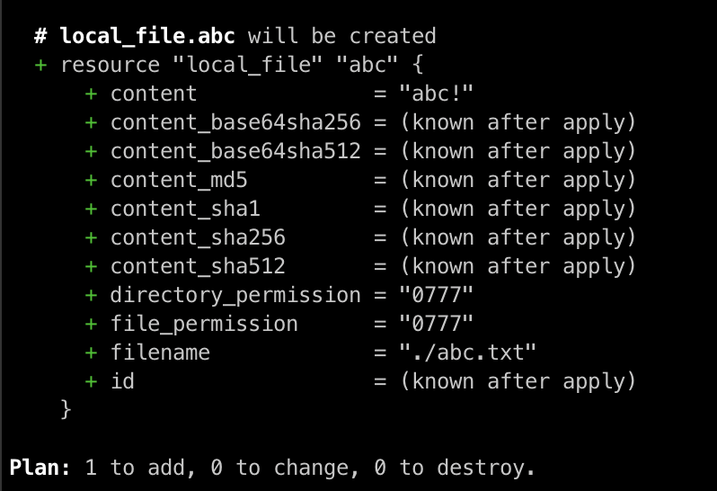 이미 프로비저닝된 구성인 resource "local_file" "abc" {}에 대해서는 변경사항이 없지만 새로 추가된 리소스 resource "local_file" "def" {} 에 대해서는 새로 생성하겠다는 실행 계획을 보여줍니다.