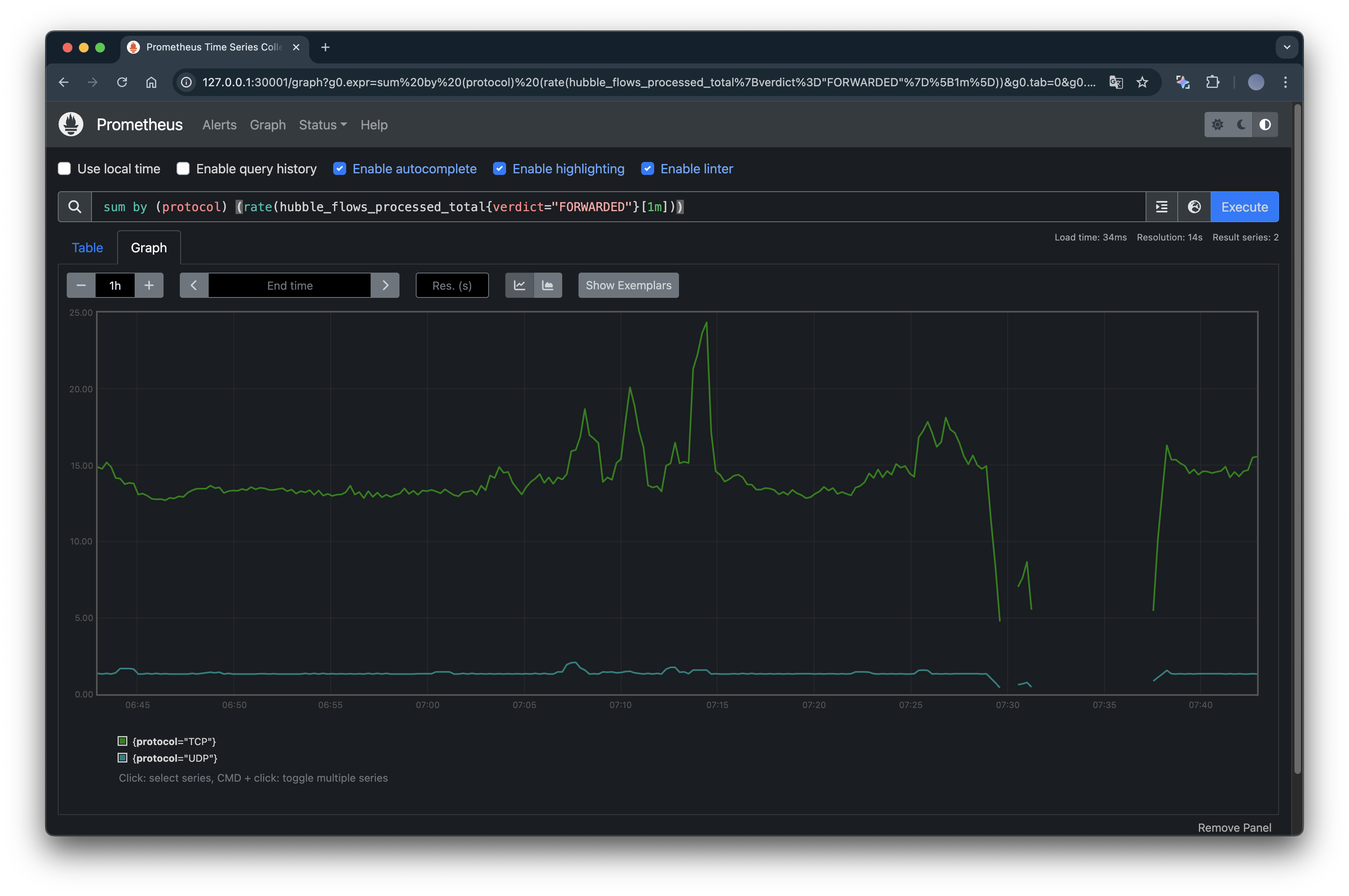 rate(hubble_flows_processed_total{protocol="TCP", verdict="FORWARDED"}[1m])