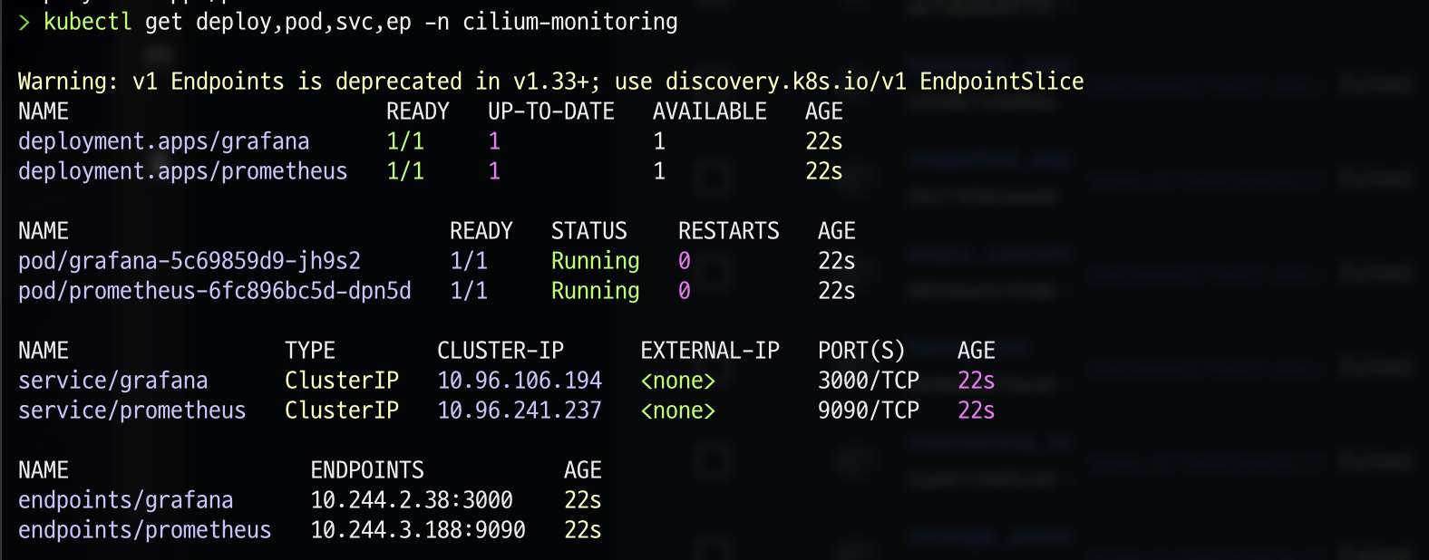 kubectl get deploy,pod,svc,ep -n cilium-monitoring