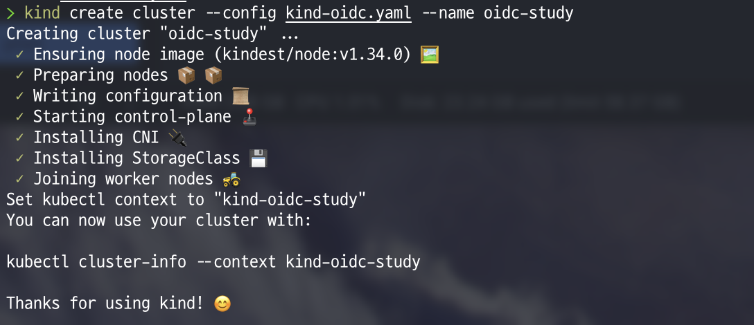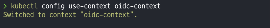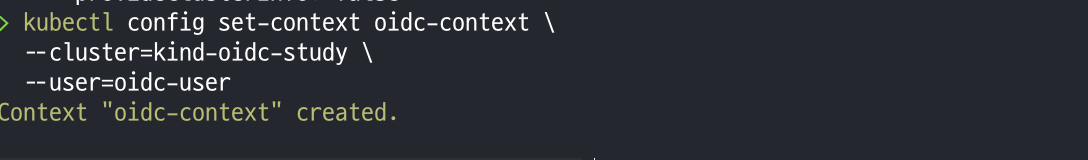 이후 모든 `kubectl` 명령이 `kind-oidc-study` 클러스터에 `oidc-user` 자격증명으로 실행됩니다.