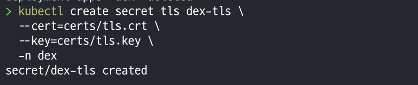 마찬가지로 위에서 설정했던 Dex Config 파일에 `secret: kubernetes-secret` 부분을 적어놨고, 옵션으로 해당 값을 입력합니다.